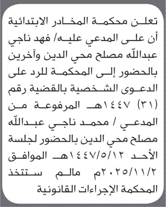 تعلن محكمة المخادر أن على المدعى عليه فهد ناجي محي الدين وآخرين الحضور إلى المحكمة إعلاناتمحاكم On أكتوبر 29, 2025 Share Share FacebookTwitterWhatsAppTelegramGoogle+البريد الإلكترونيPrint