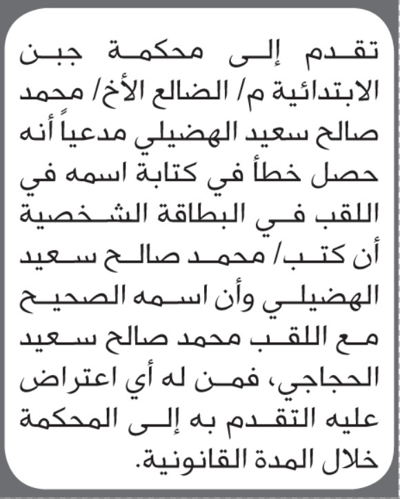 تعلن محكمة جبن أن الأخ محمد الهضيلي تقدم بطلب تصحيح اسمه إعلاناتمحاكم On أكتوبر 29, 2025 Share Share FacebookTwitterWhatsAppTelegramGoogle+البريد الإلكترونيPrint