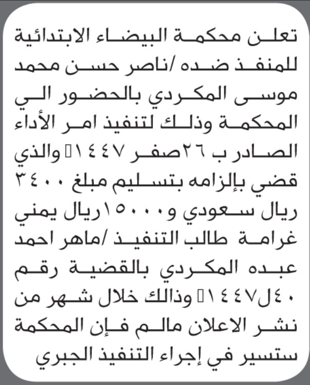 تعلن محكمة البيضاء ان على المدعى عليه ناصر المكردي الحضور الى المحكمة إعلاناتمحاكم On أكتوبر 28, 2025 Share Share FacebookTwitterWhatsAppTelegramGoogle+البريد الإلكترونيPrint