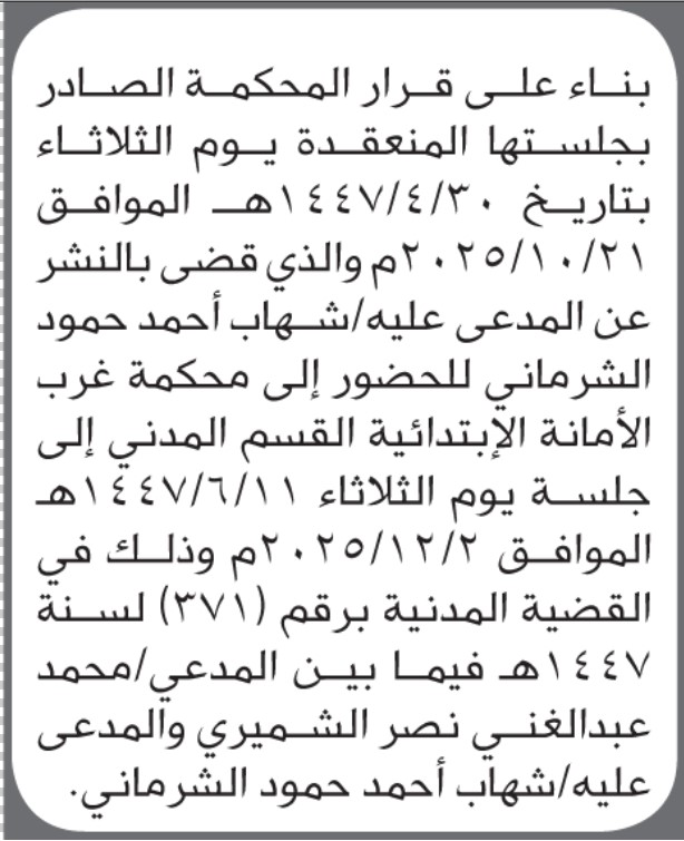 تعلن محكمة غرب الأمانة ان على المدعى عليه شهاب الشرماني إعلاناتمحاكم On أكتوبر 28, 2025 Share Share FacebookTwitterWhatsAppTelegramGoogle+البريد الإلكترونيPrint