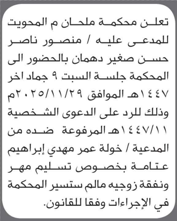 تعلن محكمة ملحان بأن على/ منصور دهمان الحضور إلى المحكمة إعلاناتمحاكم On أكتوبر 29, 2025 Share Share FacebookTwitterWhatsAppTelegramGoogle+البريد الإلكترونيPrint
