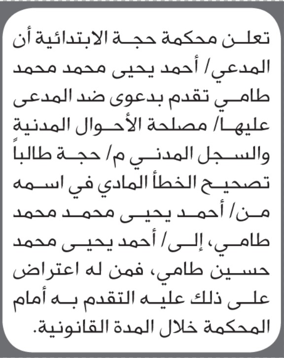 تعلن محكمة حجة الابتدائية بأن الأخ/ أحمد طامي تقدم إليها بطلب تصيح اسمه إعلاناتمحاكم On أكتوبر 29, 2025 Share Share FacebookTwitterWhatsAppTelegramGoogle+البريد الإلكترونيPrint