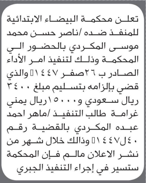 تعلن محكمة البيضاء أن على المنفذ ضده ناصر المكردي الحضور الى المحكمة إعلاناتمحاكم On أكتوبر 29, 2025 Share Share FacebookTwitterWhatsAppTelegramGoogle+البريد الإلكترونيPrint