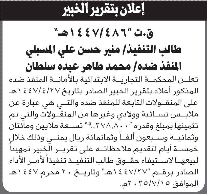 تعلن المحكمة التجارية بالأمانة أنه تم تقرير على الخبير على المنقولات التابعة لمحمد سلطان إعلاناتمحاكم On أكتوبر 29, 2025 Share Share FacebookTwitterWhatsAppTelegramGoogle+البريد الإلكترونيPrint