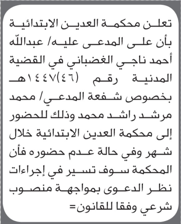 تعلن محكمة العدين أن على المدعى عليه عبدالله أحمد الغضباني الحضور إلى المحكمة إعلاناتمحاكم On أكتوبر 30, 2025 Share Share FacebookTwitterWhatsAppTelegramGoogle+البريد الإلكترونيPrint