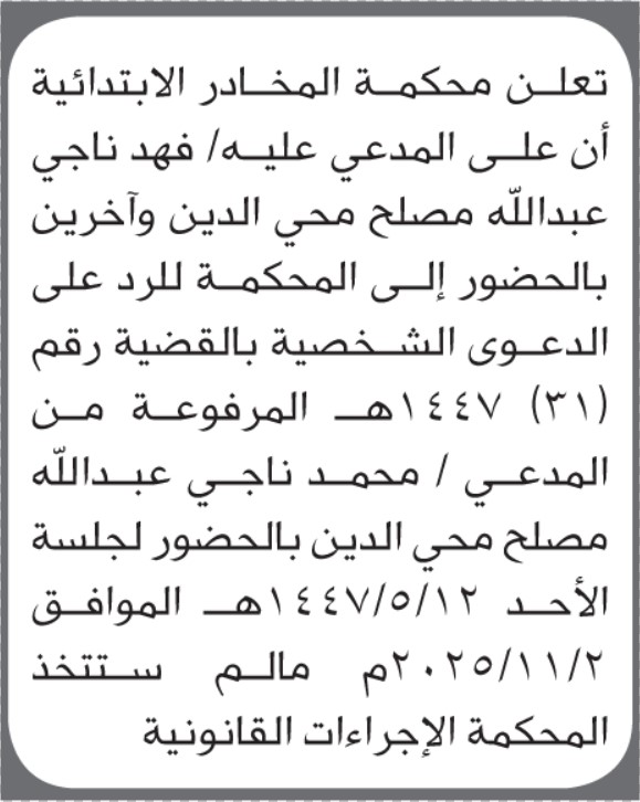 تعلن محكمة المخادر أن على المدعى عليهم فهد ناجي محي الدين وآخرين الحضور إلى المحكمة إعلاناتمحاكم On أكتوبر 30, 2025 Share Share FacebookTwitterWhatsAppTelegramGoogle+البريد الإلكترونيPrint
