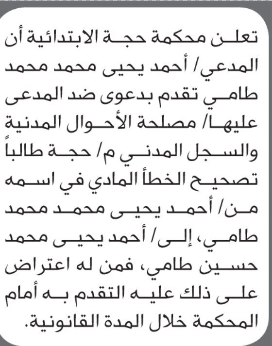 تعلن محكمة حجة أن الأخ أحمد يحيى طامي تقدم بطلب تصحيح اسمه إعلاناتمحاكم On أكتوبر 30, 2025 Share Share FacebookTwitterWhatsAppTelegramGoogle+البريد الإلكترونيPrint