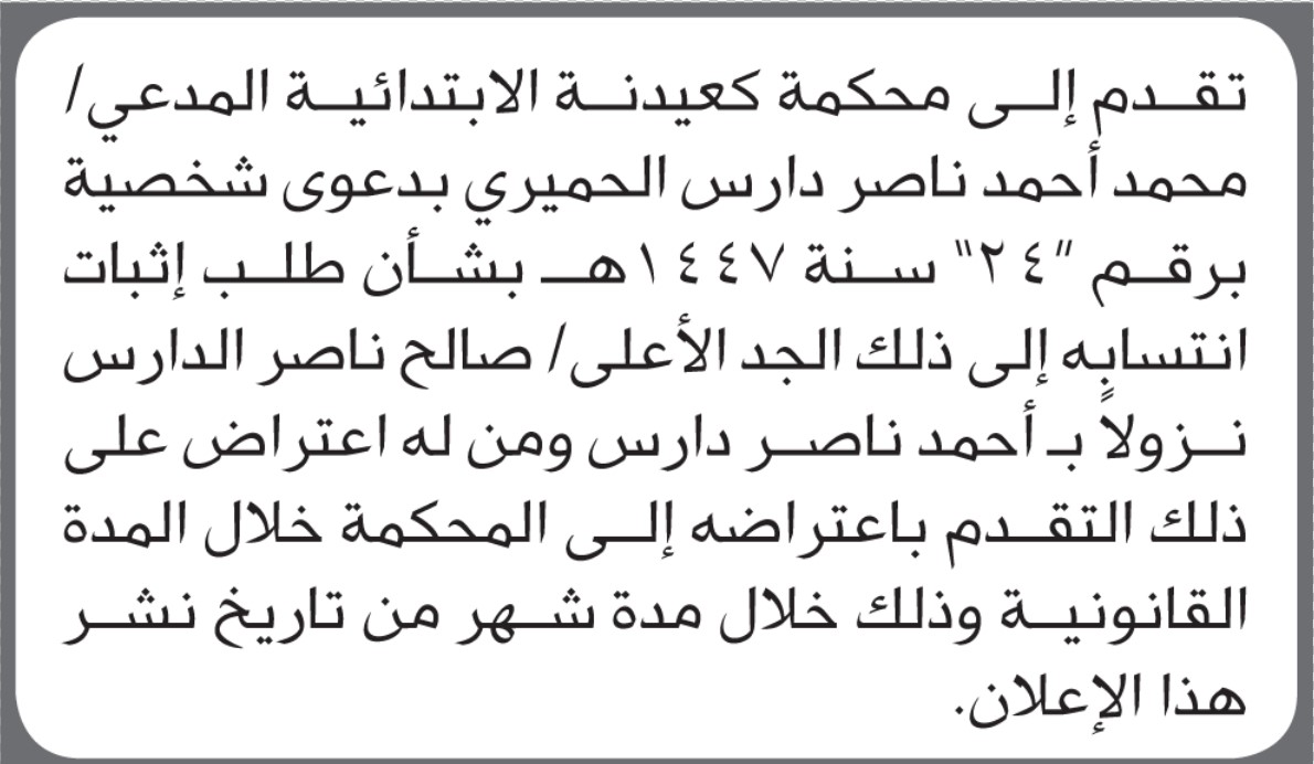 تقدم الى محكمة كعيدنة المدعي محمد الحميري بطلب إثبات انتسابه إعلاناتمحاكم On أكتوبر 30, 2025 Share Share FacebookTwitterWhatsAppTelegramGoogle+البريد الإلكترونيPrint