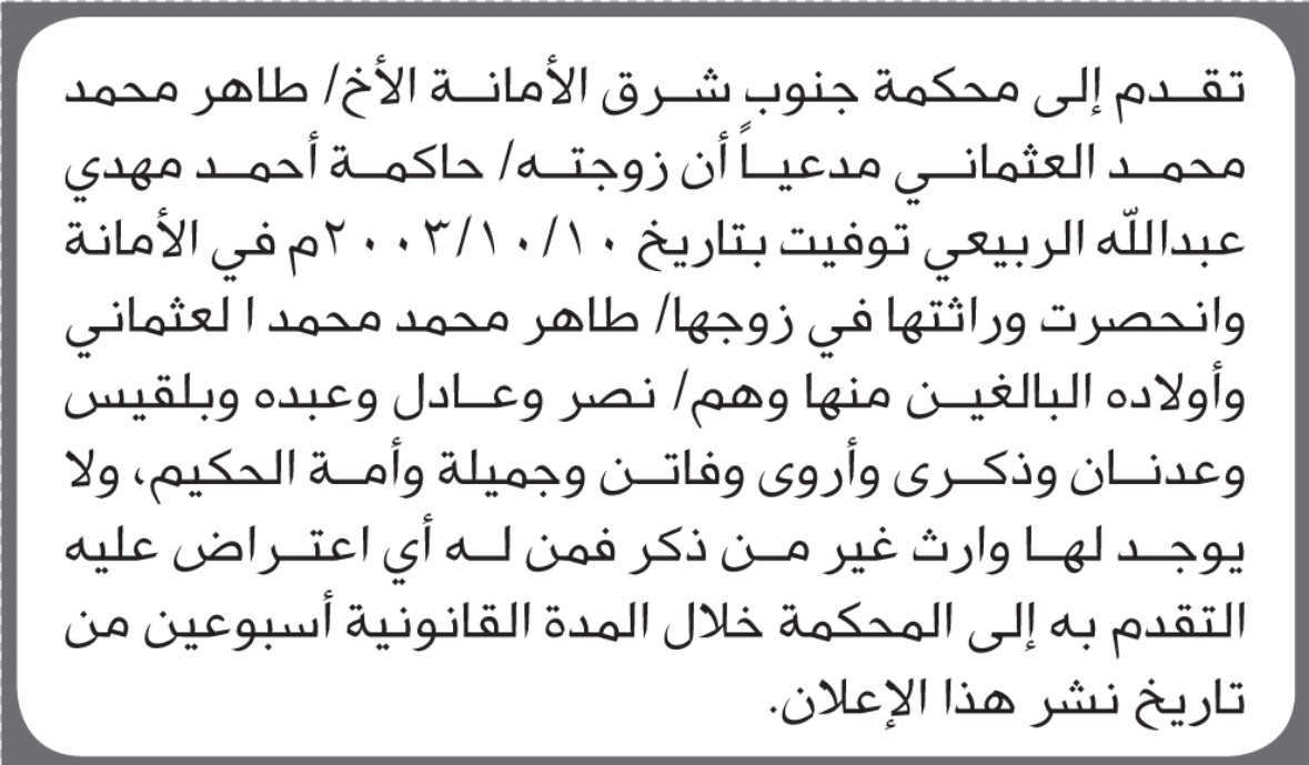 تقدم الى محكمة جنوب شرق الأمانة الأخ طاهر العثماني بطلب انحصار وراثة إعلاناتمحاكم On أكتوبر 30, 2025 Share Share FacebookTwitterWhatsAppTelegramGoogle+البريد الإلكترونيPrint