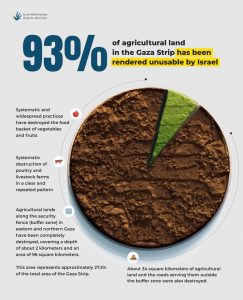 وقال “الأورومتوسطي” إن البيانات المتاحة كشفت حجم الدمار الذي لحق بقطاع الزراعة في غزة، حيث تم تدمير 1,218 بئراً زراعياً وجعلها خارج الخدمة تمامًا، وتقلصت مساحات المزروعات الخضرية من 93,000 دونم إلى نحو 4,000 دونم فقط، وتدمير أكثر من 85% من البيوت البلاستيكية (الصوبات الزراعية).