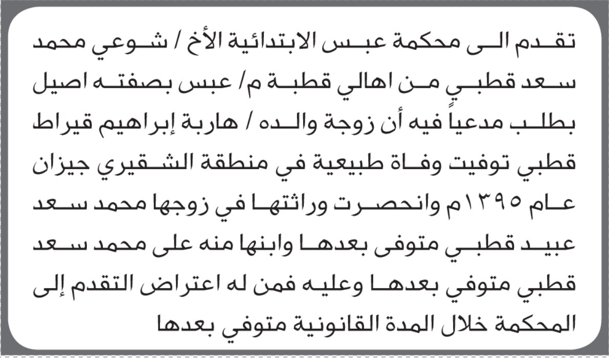 تقدم الى محكمة عبس شوعي قطبي مدعيا ان زوجة والده توفيت وفاة طبيعية إعلاناتمحاكم On أكتوبر 30, 2025 Share Share FacebookTwitterWhatsAppTelegramGoogle+البريد الإلكترونيPrint