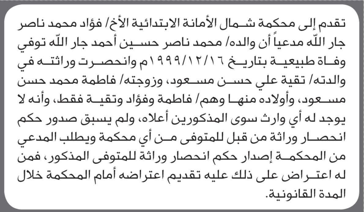 تقدم الى محكمة شمال الأمانة الأخ فؤاد جار الله مدعيا ان والده توفي وفاة طبيعية إعلاناتمحاكم On أكتوبر 30, 2025 Share Share FacebookTwitterWhatsAppTelegramGoogle+البريد الإلكترونيPrint