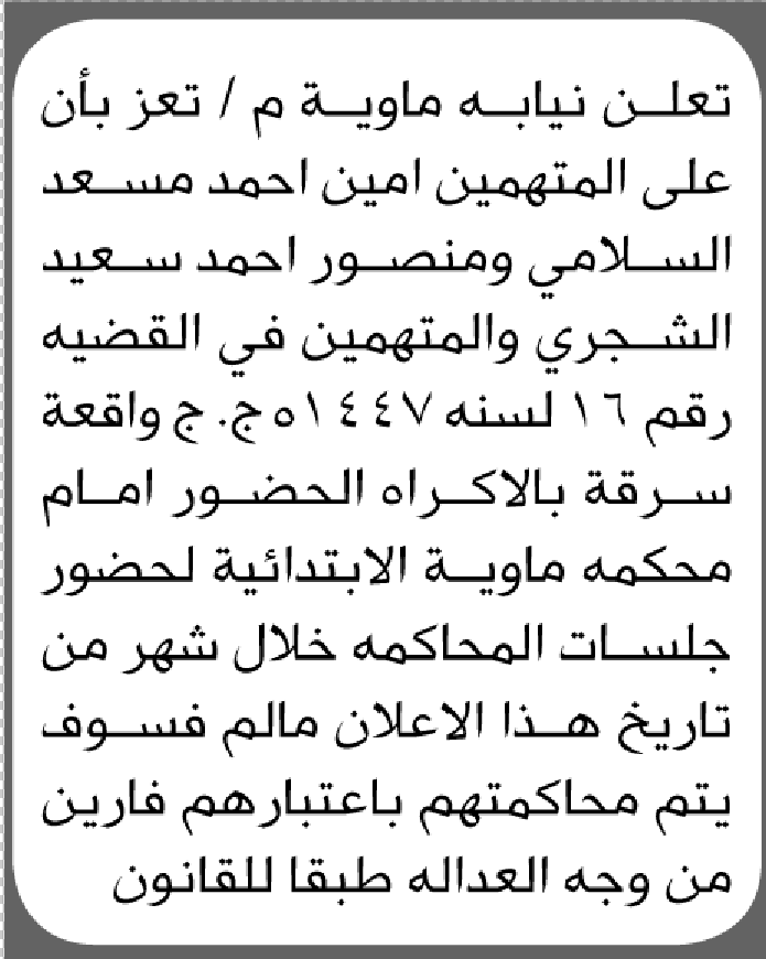 تعلن نيابة ماوية بأن على/ أمين السلامي ومنصور الشجري الحضور إلى المحكمة إعلاناتمحاكم On أكتوبر 31, 2025 Share Share FacebookTwitterWhatsAppTelegramGoogle+البريد الإلكترونيPrint