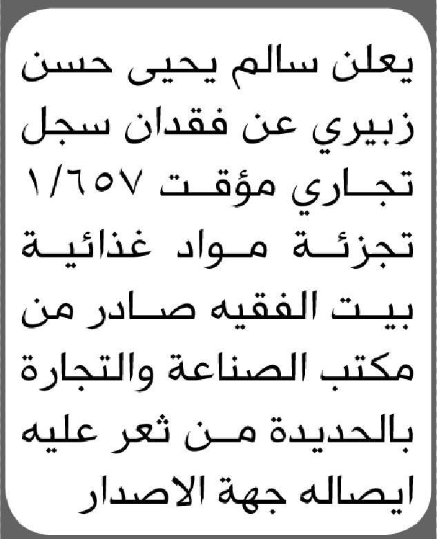 يعلن سالم يحيى زبيري عن فقدان سجل تجاري إعلاناتفقدانات On أكتوبر 31, 2025 Share Share FacebookTwitterWhatsAppTelegramGoogle+البريد الإلكترونيPrint