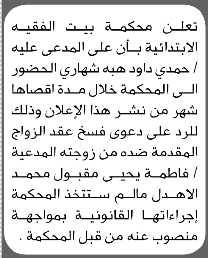 تعلن محكمة بيت الفقيه بأن على المدعي علي الحضور الى المحكمة إعلاناتمحاكم On أكتوبر 31, 2025 Share Share FacebookTwitterWhatsAppTelegramGoogle+البريد الإلكترونيPrint