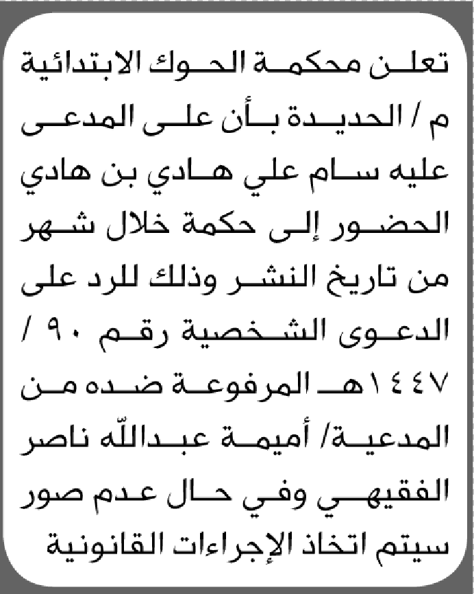 تعلن محكمة الحوك م/الحديده بأن على المدعى عليه سام هادي الحضور الى المحكمة إعلاناتمحاكم On أكتوبر 31, 2025 Share Share FacebookTwitterWhatsAppTelegramGoogle+البريد الإلكترونيPrint