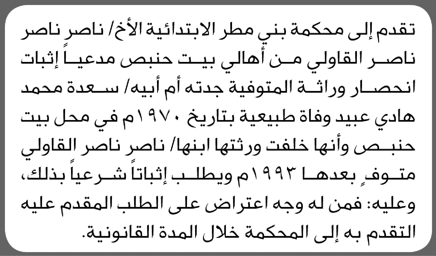 تقدم الى محكمة بني مطر الأخ ناصر القاولي مدعيا إثبات انحصار وراثة جدته إعلاناتمحاكم On نوفمبر 1, 2025 Share Share FacebookTwitterWhatsAppTelegramGoogle+البريد الإلكترونيPrint