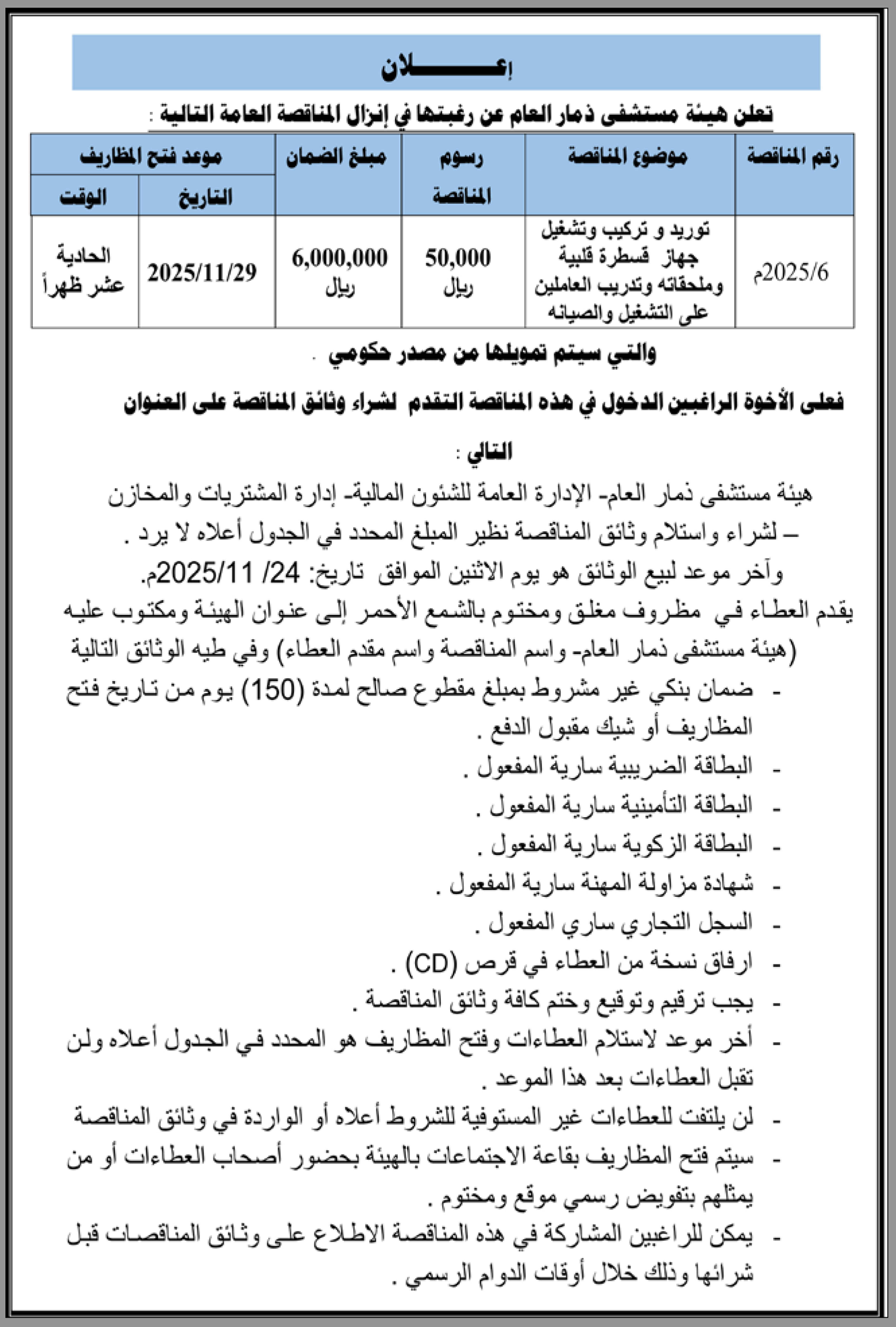 تعلن هيئة ستشفى ذمار عن إنزال مناقصة عامة إعلاناتمحاكم On نوفمبر 2, 2025 Share Share FacebookTwitterWhatsAppTelegramGoogle+البريد الإلكترونيPrint