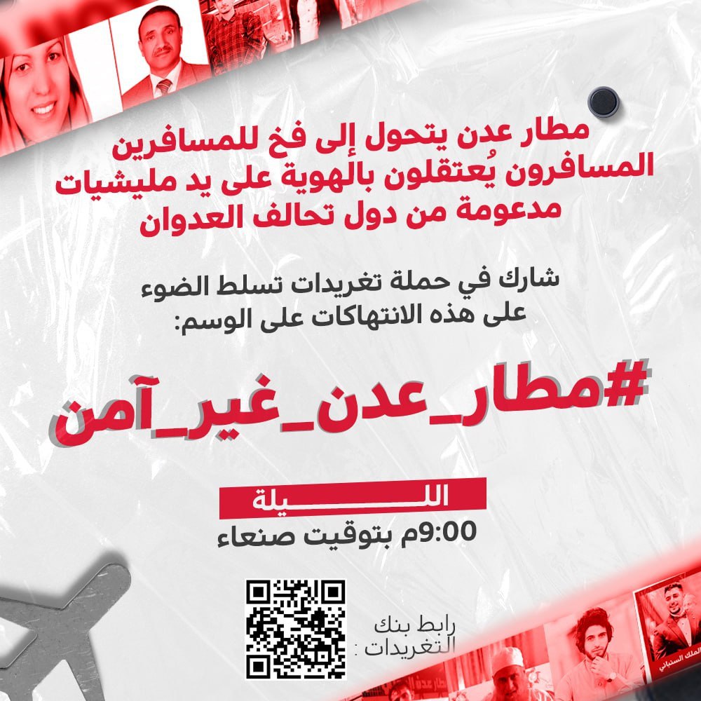 ودعا القائمون على الحملة، إلى التفاعل والمشاركة في الحملة التي تسلّط الضوء على الجرائم المتوالية والانتهاكات التي ترتكبها مليشيات تحالف العدوان بحق المسافرين عبر مطار عدن الدولي الذي تحول إلى فخ للمسافرين ممن يُعتقلون بالهوية على يد مليشيات مدعومة من دول تحالف العدوان وذلك على الوسم:
