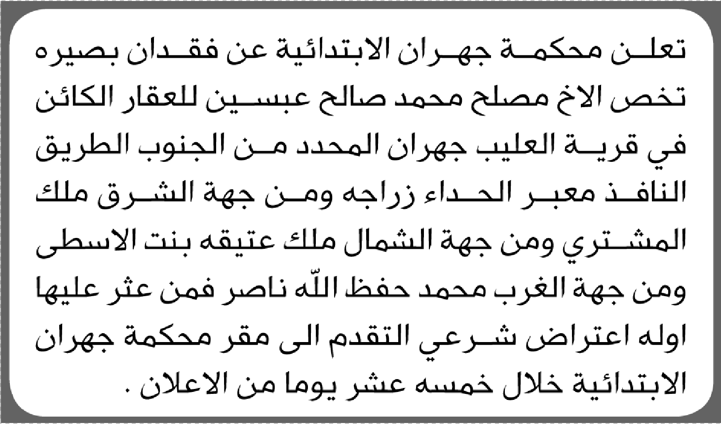 تعلن محكمة جهران الابتدائية عن فقدان بصيرة تخص/ مصلح محمد عبسين إعلاناتفقدانات On نوفمبر 3, 2025 Share Share FacebookTwitterWhatsAppTelegramGoogle+البريد الإلكترونيPrint