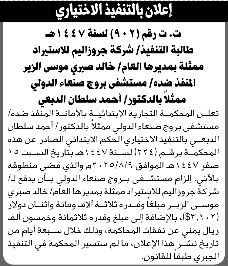 تعلن المحكمة التجارية بالأمانة للمنفذ ضده مستشفى بروج صنعاء بالتنفيذ الاختياري للحكم إعلاناتمحاكم On نوفمبر 3, 2025 Share Share FacebookTwitterWhatsAppTelegramGoogle+البريد الإلكترونيPrint