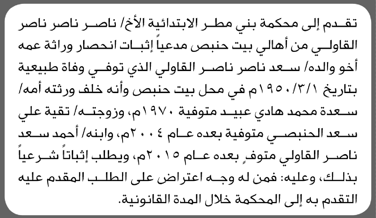 تعلن محكمة بني مطر أن الأخ ناصر القاولي تقدم بدعوى انحصار وراثة إعلاناتمحاكم On نوفمبر 3, 2025 Share Share FacebookTwitterWhatsAppTelegramGoogle+البريد الإلكترونيPrint