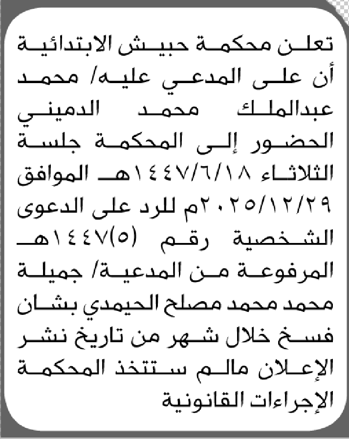 تعلن محكمة حبيش الابتدائية بأن على/ محمد الدميني الحضور إلى المحكمة إعلاناتمحاكم On نوفمبر 4, 2025 Share Share FacebookTwitterWhatsAppTelegramGoogle+البريد الإلكترونيPrint