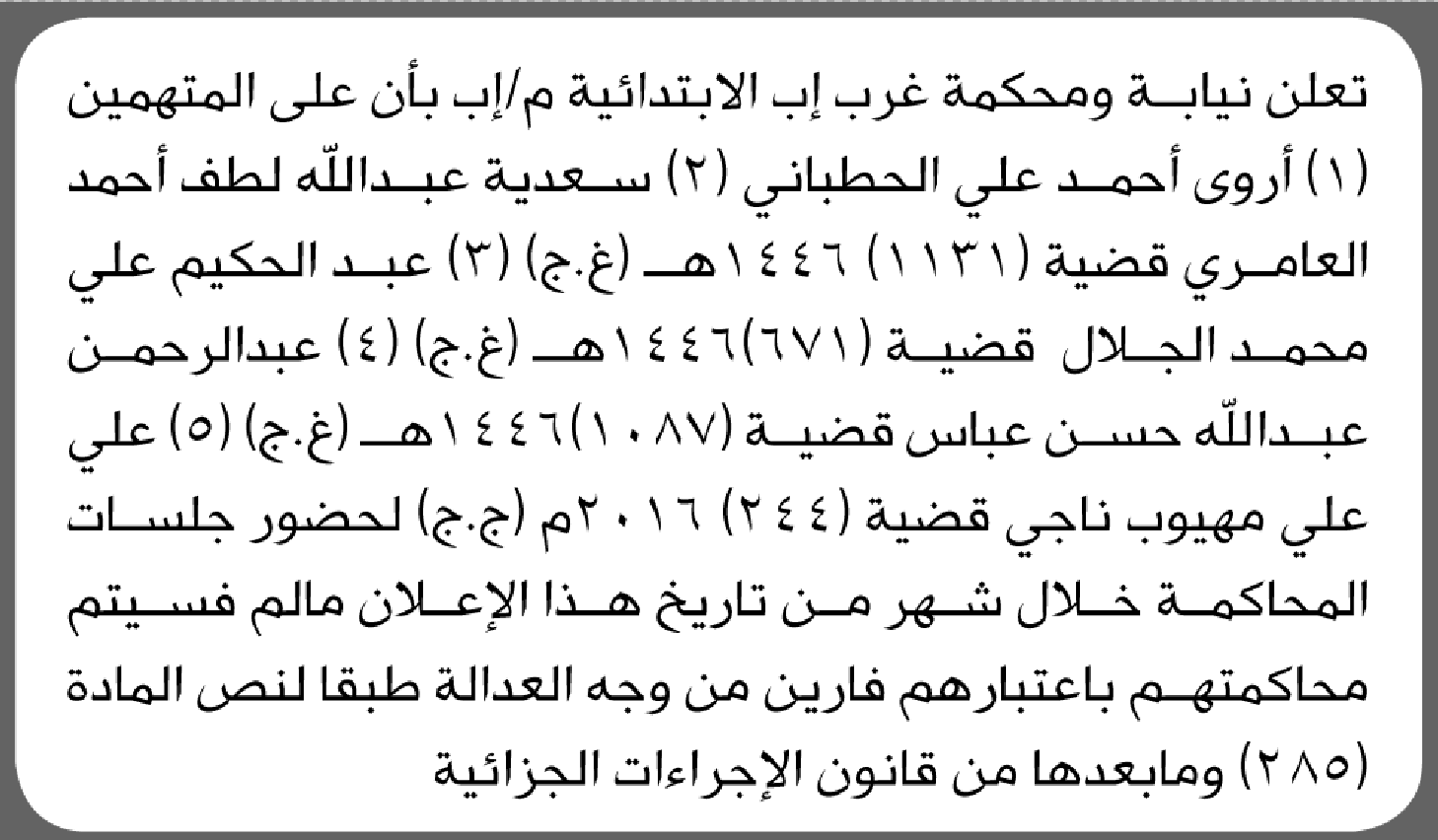 تعلن نيابة ومحكمة غرب اب ان على المتهمين أروى الحطباني ومن إليها الحضور إعلاناتمحاكم On نوفمبر 3, 2025 Share Share FacebookTwitterWhatsAppTelegramGoogle+البريد الإلكترونيPrint
