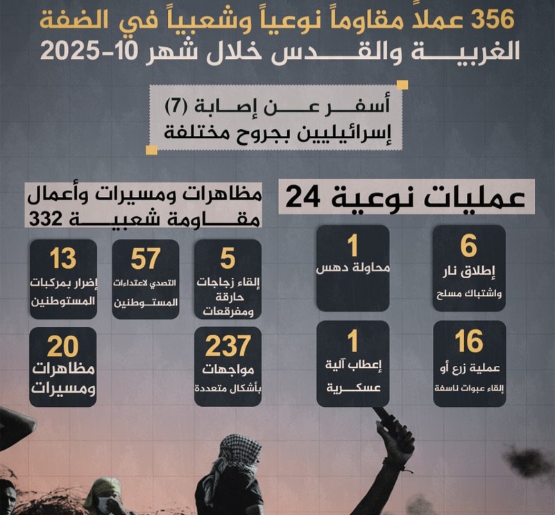 وذكر أن مجمل أعمال المقاومة خلال شهر أكتوبر بلغت 356 عملاً مقاوماً نوعياً وشعبياً، أسفرت عن إصابة 8 “إسرائيليين” بجراح مختلفة.