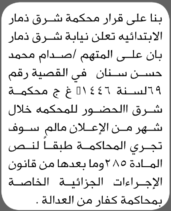 تعلن محكمة شرق ذمار الابتدائية بأن على/ صدام سنان الحضور إلى المحكمة إعلاناتمحاكم On نوفمبر 5, 2025 Share Share FacebookTwitterWhatsAppTelegramGoogle+البريد الإلكترونيPrint