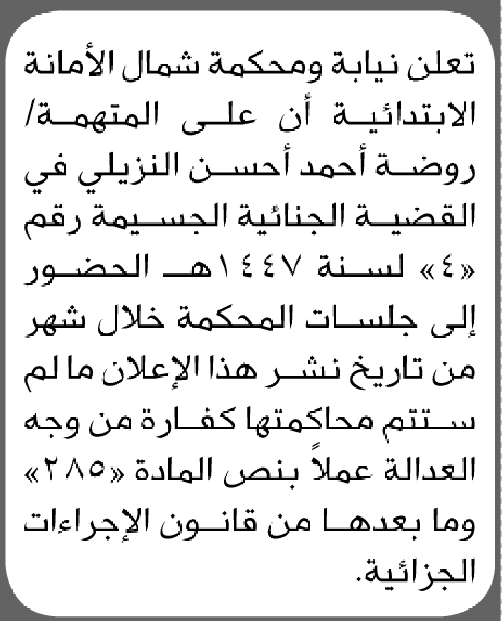 تعلن نيابة ومحكمة شمال الأمانة أن على المتهمة روضة النزيلي الحضور الى المحكمة إعلاناتمحاكم On نوفمبر 6, 2025 Share Share FacebookTwitterWhatsAppTelegramGoogle+البريد الإلكترونيPrint