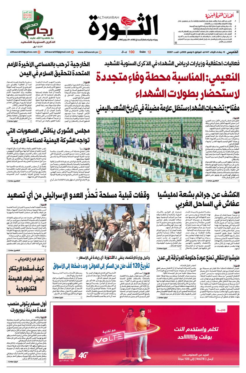 الصحيفة الورقية صحيفة الثورة الخميس 15 جمادى الاولى 1447 – 6 نوفمبر 2025 On نوفمبر 5, 2025 Share View Fullscreen Share FacebookTwitterWhatsAppTelegramGoogle+البريد الإلكترونيPrint