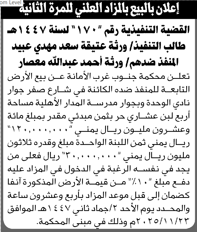 تعلن محكمة جنوب غرب الأمانة عن بيع الأرض التابعة للمنفذ ضدهم ورثة أحمد معصار إعلاناتمحاكم On نوفمبر 6, 2025 Share Share FacebookTwitterWhatsAppTelegramGoogle+البريد الإلكترونيPrint