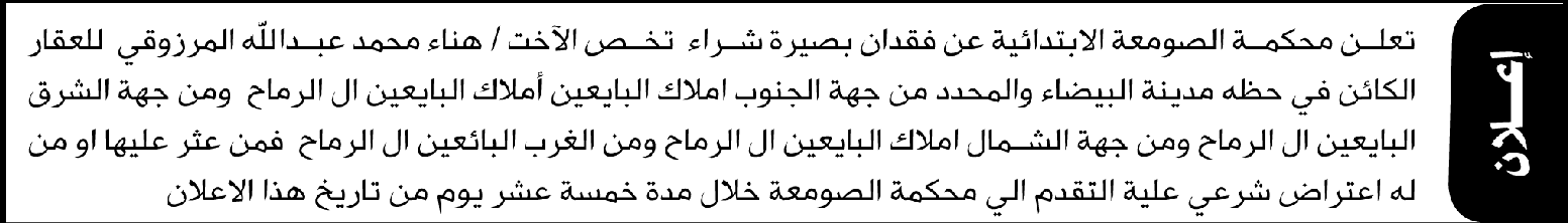 تعلن محكمة الصومعة عن فقدان بصيرة شراء عقار تخص الأخت هناء محمد المزروقي إعلاناتمحاكم On نوفمبر 6, 2025 Share Share FacebookTwitterWhatsAppTelegramGoogle+البريد الإلكترونيPrint