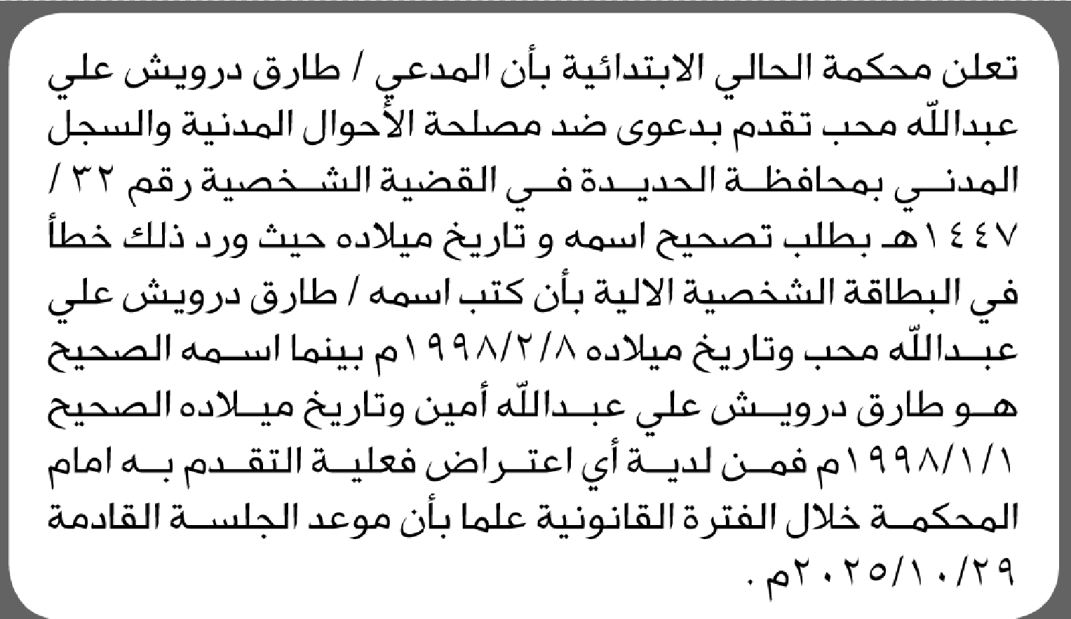 تقدم محكمة الحالي الأخ طارق درويش بدعوى ضد مصلحة الاحوال المدنية إعلاناتمحاكم On نوفمبر 7, 2025 Share Share FacebookTwitterWhatsAppTelegramGoogle+البريد الإلكترونيPrint