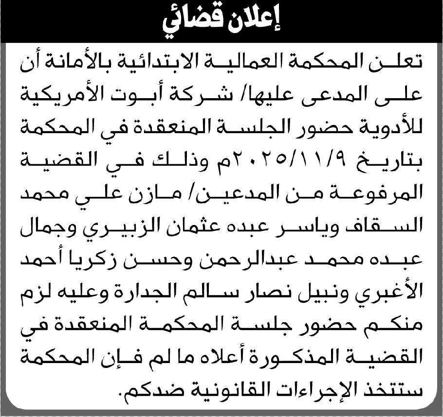 تعلن المحكمة العمالية بالأمانة أن على المدعى عليها شركة أبوت الأمريكية للأدوية الحضور إلى المحكمة إعلاناتمحاكم On نوفمبر 7, 2025 Share Share FacebookTwitterWhatsAppTelegramGoogle+البريد الإلكترونيPrint