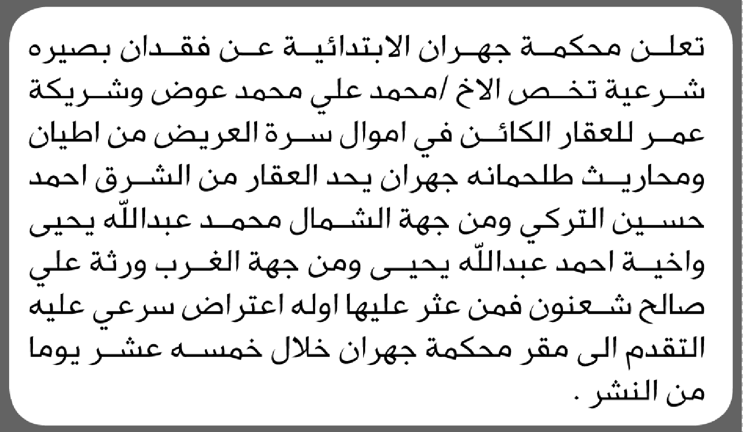 تعلن محكمة جهران عن فقدان بصيرة تخص الأخ محمد علي محمد وشريكه عمر إعلاناتفقدانات On نوفمبر 7, 2025 Share Share FacebookTwitterWhatsAppTelegramGoogle+البريد الإلكترونيPrint