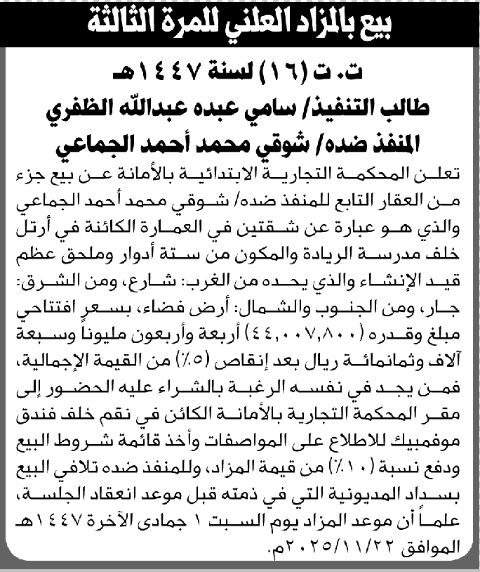 تعلن المحكمة التجارية بالأمانة عن بيع جزء من العقار التابع للمنفذ ضده شوقي الجماعي إعلاناتمحاكم On نوفمبر 8, 2025 Share Share FacebookTwitterWhatsAppTelegramGoogle+البريد الإلكترونيPrint