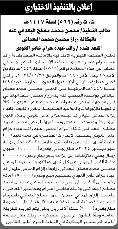 تعلن المحكمة التجارية بالأمانة للمنفذ ضده رائد عبده العودي بالتنفيذ الاختياري للحكم إعلاناتمحاكم On نوفمبر 10, 2025 Share Share FacebookTwitterWhatsAppTelegramGoogle+البريد الإلكترونيPrint