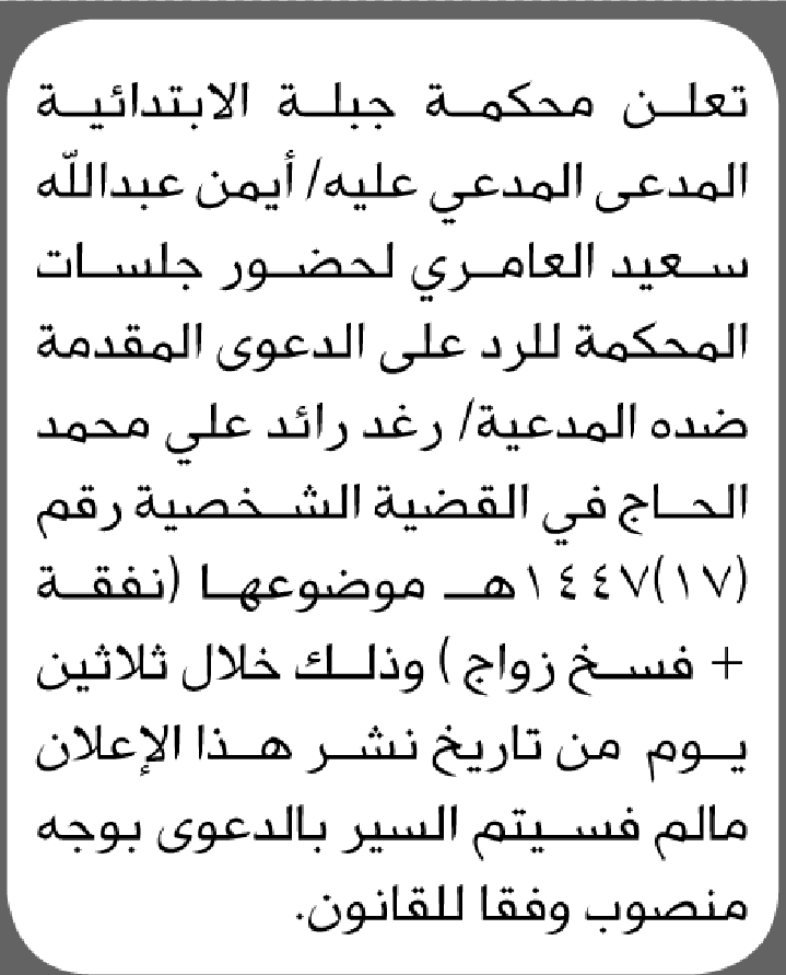 تعلن محكمة جبلة أن على المدعى عليه أيمن عبدالله العامري الحضور إلى المحكمة إعلاناتمحاكم On نوفمبر 10, 2025 Share Share FacebookTwitterWhatsAppTelegramGoogle+البريد الإلكترونيPrint