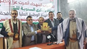 وفي الفعالية التي حضرها أمين عام الهيئة أحمد عاطف، والأمين العام المساعد صدام الراعي، ورؤساء الدوائر ومدراء عموم وموظفون، تم تكرّيم أسرة الشهيد الدكتور محمد عبدالملك المتوكل، بدرع الوفاء تسلّمه نجله ريدان المتوكل، عرفاناً بتضحيات الشهيد في سبيل الوطن والحرية والعدالة والكرامة وما قدمه للوطن في المجال العلمي والأكاديمي.