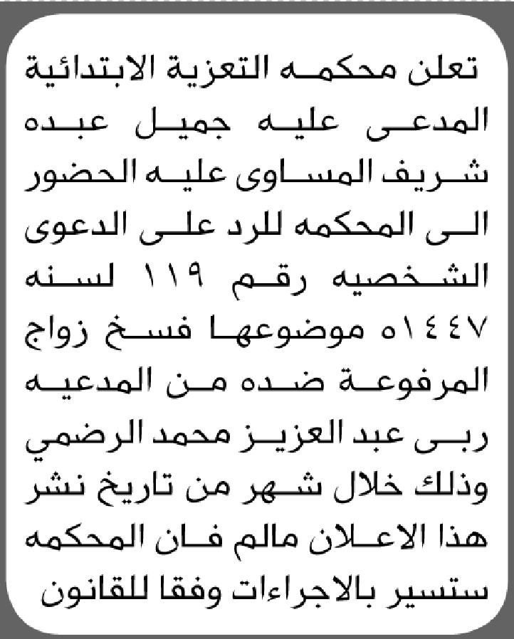 تعلن محكمة التعزية أن على المدعى عليه جميل المساوى الحضور الى المحكمة إعلاناتمحاكم On نوفمبر 10, 2025 Share Share FacebookTwitterWhatsAppTelegramGoogle+البريد الإلكترونيPrint
