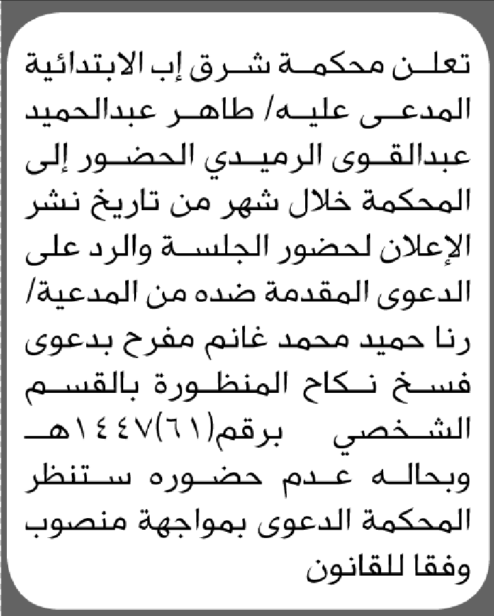 تعلن محكمة شرق إب أن على المدعى عليه طاهر الرميدي الحضور الى المحكمة إعلاناتمحاكم On نوفمبر 10, 2025 Share Share FacebookTwitterWhatsAppTelegramGoogle+البريد الإلكترونيPrint