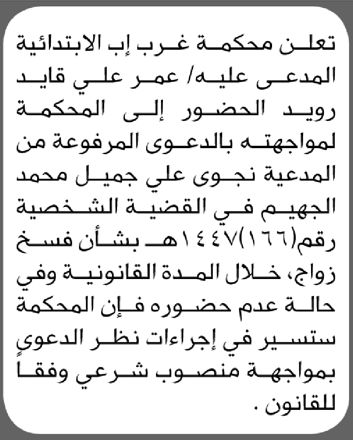 تعلن محكمة غرب إب أن على المدعى عليه عمر رويد الحضور الى المحكمة إعلاناتمحاكم On نوفمبر 11, 2025 Share Share FacebookTwitterWhatsAppTelegramGoogle+البريد الإلكترونيPrint