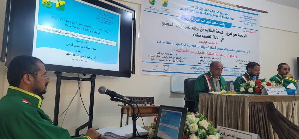 نال الباحث محمد ضيف الله حسن فارس درجة الماجستير من قسم التربية الرياضية، بكلية التربية الرياضية، جامعة صنعاء، عن رسالته الموسومة بـ “الرياضة نحو تعزيز الصحة المثالية من وجهة نظر أفراد المجتمع في أمانة العاصمة صنعاء”. وذلك يوم الاثنين 19 جمادى الأولى 1447هـ الموافق 10 نوفمبر 2025م.