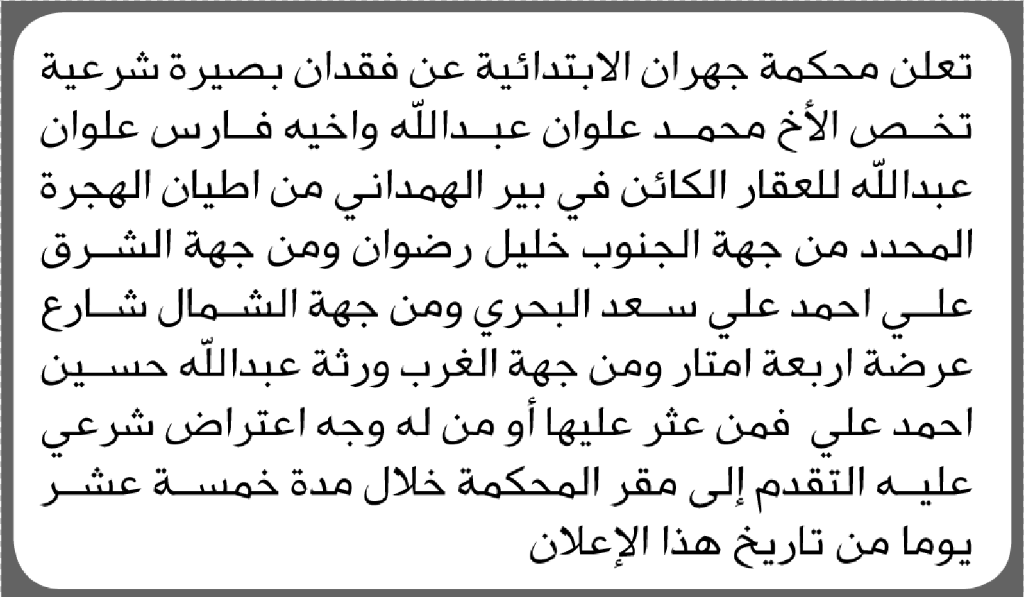 تعلن محكمة جهران عن فقدان بصيرة شرعية تخص الاخوة محمد وفارس علوان إعلاناتمحاكم On نوفمبر 14, 2025 Share Share FacebookTwitterWhatsAppTelegramGoogle+البريد الإلكترونيPrint