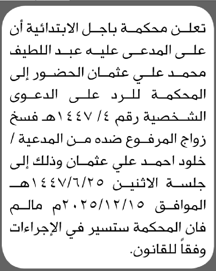 تعلن محكمة باجل أن على المدعى عليه عبداللطيف محمد علي الحضور إلى المحكمة إعلاناتمحاكم On نوفمبر 15, 2025 Share Share FacebookTwitterWhatsAppTelegramGoogle+البريد الإلكترونيPrint