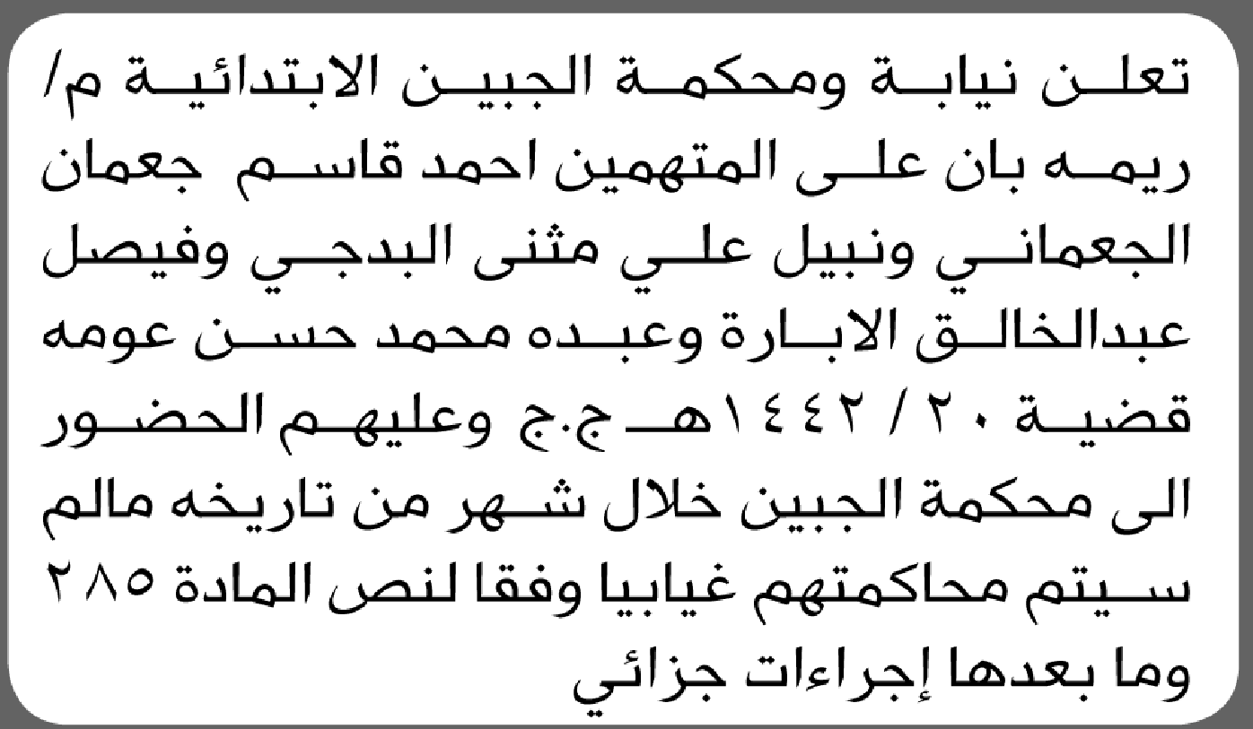 تعلن نيابة ومحكمة الجبين أن على المتهمين أحمد الجعماني وآخرين الحضور إلى المحكمة إعلاناتمحاكم On نوفمبر 15, 2025 Share Share FacebookTwitterWhatsAppTelegramGoogle+البريد الإلكترونيPrint