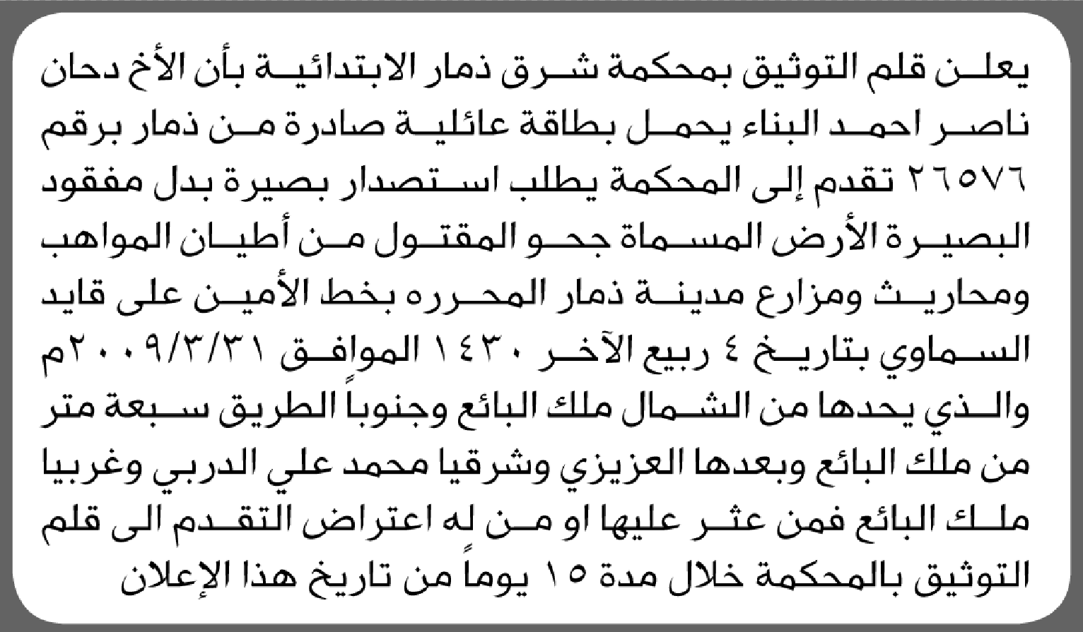 تعلن محكمة شرق ذمار الابتدائية عن فقدان بصيرة تخص الأخ / دحان ناصر البناء إعلاناتفقدانات On نوفمبر 16, 2025 Share Share FacebookTwitterWhatsAppTelegramGoogle+البريد الإلكترونيPrint