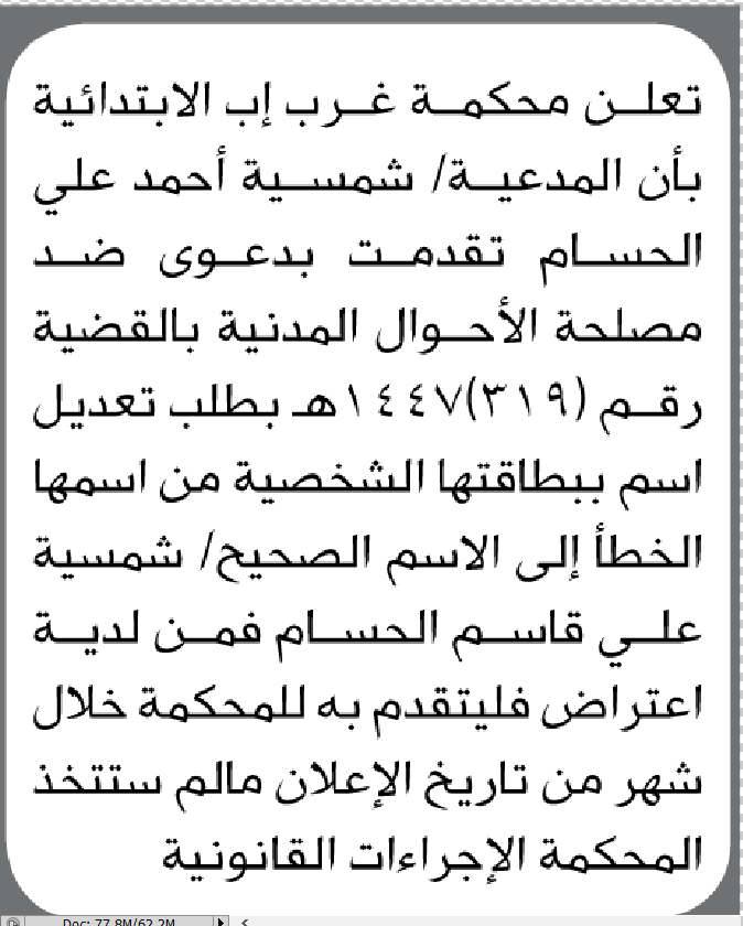 تعلن محكمة غرب إب الابتدائية بأن الأخت/ شمسية أحمد الحسام تقدمت إليها بطلب تعديل اسمها إعلاناتمحاكم On نوفمبر 17, 2025 Share Share FacebookTwitterWhatsAppTelegramGoogle+البريد الإلكترونيPrint